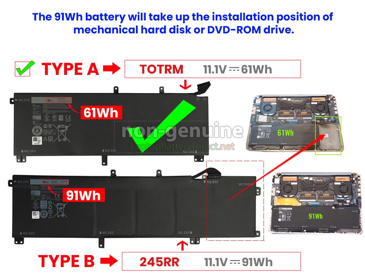 This is a high capacity(91Wh) battery,it's longer than the standard 61Wh battery, and it will take up the installation position of mechanical hard disk or DVD-ROM drive. You can use the 91Wh battery unless your laptop not installed the mechanical hard disk or DVD-ROM, otherwise please use the 61Wh battery.Product Larger Images