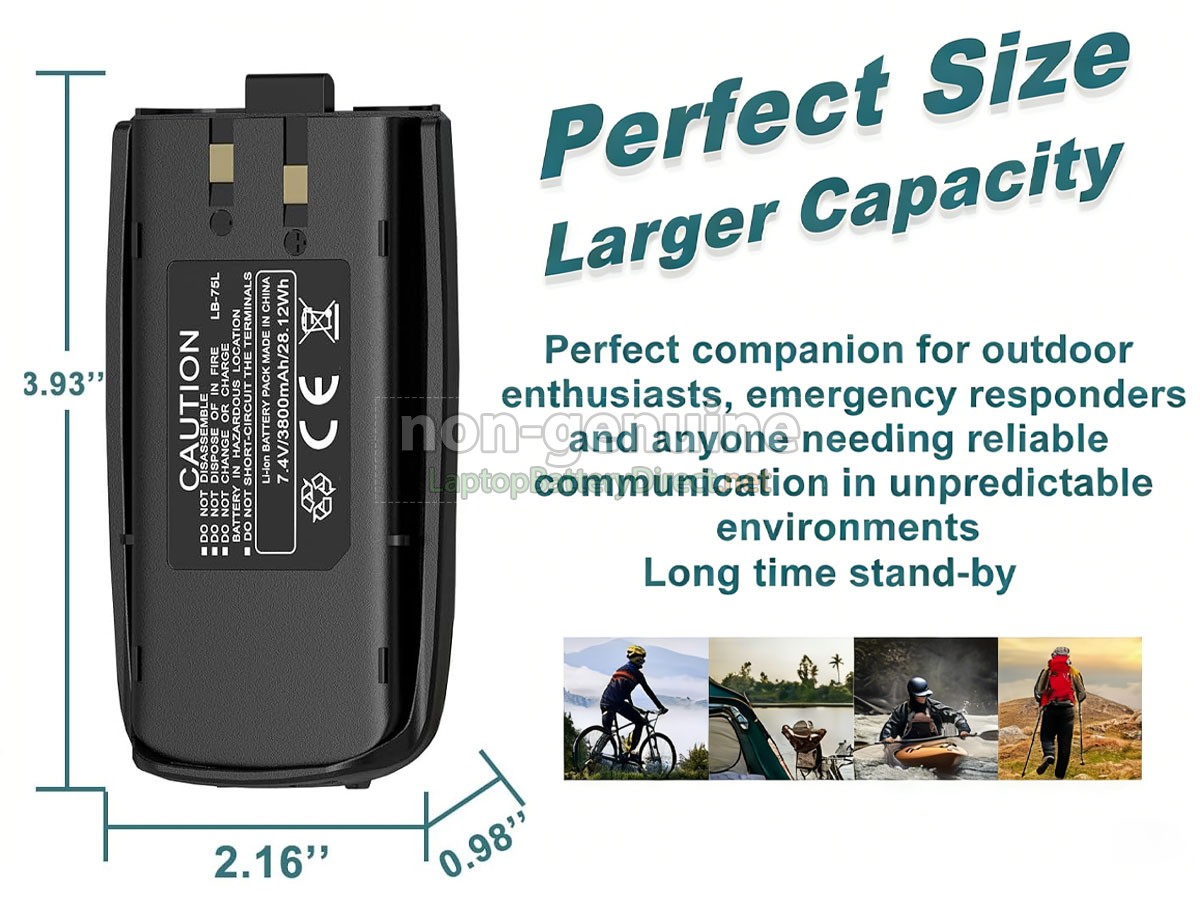 The 7.4V 3800mAh(2 cells) TYT LB-75L battery is made of high-quality lithium-ion battery cells, which has been tested to be brand new and totally compatible with the original manufacturer specifications, meets or even exceeds the original battery performance. With high-quality battery cells and materials, your equipment will run longer and more secure. Moreover, this battery has no "memory effect" and you don’t need to discharge before each charge. It is more convenient for you to use our replacement TYT LB-75L batteries.Our TYT LB-75L battery which we design is in strict accordance with the highest control standards. It carries with a smart interior circuit board that provides battery-unbalanced-shut-off protection, thermal runaway protection, overcharged protection, over-discharged-shut-off protection, and high/low-temperature-shut-off protection. TYT LB-75L battery is made of environmentally friendly materials, without lead and mercury. It is certified as a safe and reliable product through a series of rigorous tests on the TYT examine system.